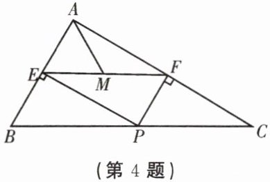 4. 如图,在 $\triangle ABC$ 中,$AB = 6$,$AC = 8$,$BC = 10$,点 $P$ 为边 $BC$ 上一动点(且点 $P$ 不与点 $B$,$C$ 重合),$PE \perp AB$ 于点 $E$,$PF \perp AC$ 于点 $F$,$M$ 为 $EF$ 中点。设 $AM$ 的长为 $x$,则 $x$ 的取值范围是