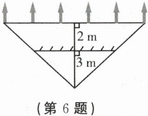 6. 如图,某校宣传栏后面 $ 2 $ m 处种了一排树,其中每隔 $ 2 $ m 种 $ 1 $ 棵树,一共种了 $ 6 $ 棵,小勇站在正对宣传栏中间位置且垂直距离为 $ 3 $ m 处,刚好看到两端树的树干,其余的 $ 4 $ 棵树均被挡住,那么宣传栏的长为____ m.(不计宣传栏的厚度和树的粗细)