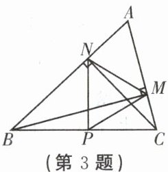 3. 如图,在 $ \triangle ABC $ 中,$ \angle A = 60^{\circ} $,$ BM \perp AC $ 于点 $ M $,$ CN \perp AB $ 于点 $ N $,$ P $ 为边 $ BC $ 的中点,连接 $ PM $,$ PN $. 有下列结论:① $ PM = PN $;② $ \frac{AM}{AB} = \frac{AN}{AC} $;③ $ \triangle PMN $ 为等边三角形;④ 当 $ \angle ABC = 45^{\circ} $ 时,$ BN = \sqrt{2}PC $. 其中正确的结论有( )