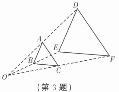 3. 如图,$ \triangle ABC $ 与 $ \triangle DEF $ 位似,点 $ O $ 为位似中心。已知 $ OA : OD = 1 : 2 $,则 $ \triangle ABC $ 与 $ \triangle DEF $ 的面积比为 ( )
