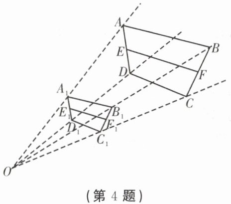 4. 如图,四边形 $ ABCD $ 与四边形 $ A_1B_1C_1D_1 $ 是以点 $ O $ 为位似中心的位似图形,满足 $ OA_1 = A_1A $,点 $ E $,$ F $,$ E_1 $,$ F_1 $ 分别是 $ AD $,$ BC $,$ A_1D_1 $,$ B_1C_1 $ 的中点,则 $ \frac{E_1F_1}{EF} = $ 。