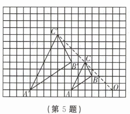 5. 如图,图中的小方格都是边长为 $ 1 $ 的小正方形,$ \triangle ABC $ 与 $ \triangle A'B'C' $ 是以点 $ O $ 为位似中心的位似图形,它们的顶点都在小正方形的顶点上,则 $ \triangle ABC $ 与 $ \triangle A'B'C' $ 的相似比为 。