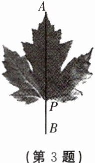 3. 大自然是美的设计师,即使是一片小小的树叶,也蕴含着“黄金分割”.如图,点 $ P $ 为 $ AB $ 的黄金分割点 $ (AP > PB) $,如果 $ AB $ 的长度为 $ 10 \mathrm{~cm} $,那么 $ PB $ 的长为