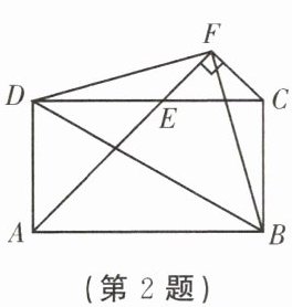 2. 如图,在矩形 $ABCD$ 中,$AB>AD$,$\angle DAB$ 的平分线与 $CD$ 交于点 $E$,过点 $C$ 作 $CF\perp AE$ 于点 $F$,连接 $BF$,$DF$。有下列结论:① $DE = BC$;② $DF = BF$;③ $\angle CDF=\angle CBF$;④ $B$,$C$,$D$,$F$ 四点在同一个圆上。其中正确结论的个数为( )