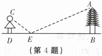 4. 为了测量校园内一棵不可攀的树的高度,学校数学应用实践小组做了如下的探索:根据光的反射定律,利用一面镜子和皮尺,设计如图所示的测量方案:把镜子放在离树($ AB $)$ 8.7 \, m $ 的点 $ E $ 处,然后观测者沿着直线 $ BE $ 后退到点 $ D $,这时恰好在镜子里看到树梢顶点 $ A $,再用皮尺量得 $ DE = 2.7 \, m $,观测者目高 $ CD = 1.6 \, m $,则树高 $ AB $ 约是