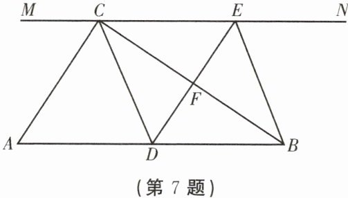 7. 如图,在 $\mathrm{Rt}\triangle ABC$ 中,$\angle ACB = 90^{\circ}$,过点 $C$ 的直线 $MN// AB$,$D$ 为 $AB$ 边上一点,过点 $D$ 作 $DE\perp BC$,交直线 $MN$ 于点 $E$,垂足为点 $F$,连接 $CD$,$BE$。