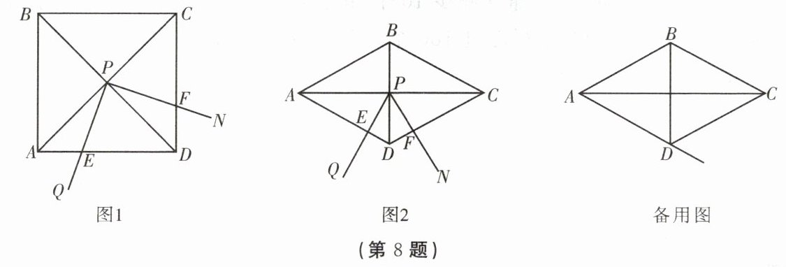 8. 如图 $1$,$\angle QPN$ 的顶点 $P$ 在正方形 $ABCD$ 的两条对角线的交点处,$\angle QPN=\alpha$,将 $\angle QPN$ 绕点 $P$ 旋转,旋转过程中 $\angle QPN$ 的两边分别与正方形 $ABCD$ 的边 $AD$ 和 $CD$ 交于点 $E$ 和点 $F$(点 $F$ 与点 $C$,$D$ 不重合)。
