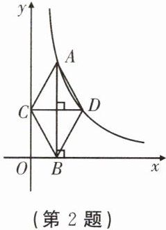 2. 如图,在平面直角坐标系中,点 $ A $ 在函数 $ y = \frac{4}{x} $($ x > 0 $)的图象上,$ AB \perp x $ 轴于点 $ B $,$ AB $ 的垂直平分线与 $ y $ 轴交于点 $ C $,与函数 $ y = \frac{4}{x} $($ x > 0 $)的图象交于点 $ D $。连接 $ AC $,$ CB $,$ BD $,$ DA $,则四边形 $ ACBD $ 的面积等于( )