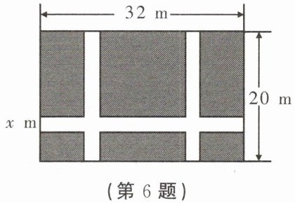 6.如图,某小区计划在一块长为32m,宽为20m的矩形空地上修建三条同样宽的道路,剩余的空地上种植草坪,使草坪的面积为570m^{2}.若设道路的宽为$x$m,则下面所列方程正确的是 ( )