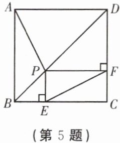 5. 如图,已知正方形 $ABCD$ 的边长为 $4$,$P$ 是对角线 $BD$ 上一点,$PE\perp BC$ 于点 $E$,$PF\perp CD$ 于点 $F$,连接 $AP$,$EF$.给出下列结论:①$PD = \sqrt{2}DF$;②四边形 $PECF$ 的周长为 $8$;③$EF$ 的最小值为 $2$;④$AP\perp EF$.其中正确结论的序号为____.