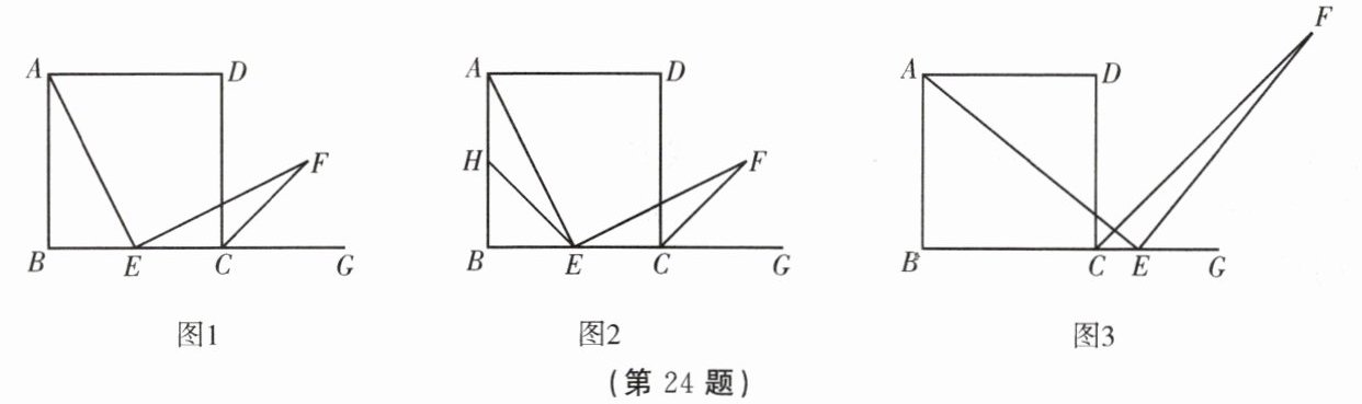 24. (8 分)如图 1,四边形 $ABCD$ 是正方形,点 $E$ 是边 $BC$ 的中点,$\angle AEF = 90^{\circ}$,且 $EF$ 交正方形 $ABCD$ 的外角 $\angle DCG$ 的平分线 $CF$ 于点 $F$.