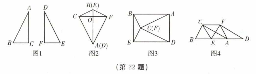 22. (8 分)在数学课上,王老师让同学们对两张全等的直角三角形纸片进行摆弄.如图 1,$Rt\triangle ABC \cong Rt\triangle DEF$,$\angle ACB = \angle DFE = 90^{\circ}$.