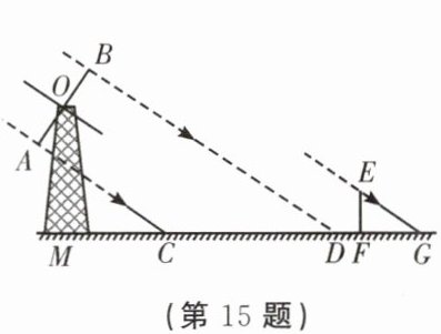 15. 如图所示的是某风车示意图,其相同的四个叶片均匀分布,水平地面上的点 $M$ 在旋转中心 $O$ 的正下方,某一时刻,太阳光线恰好垂直照射叶片 $OA$,$OB$,此时各叶片的影子在点 $M$ 右侧构成线段 $CD$. 测得 $MC = 8.5$ m,$CD = 13$ m,此时垂直于地面的木棒 $EF$ 与影子 $FG$ 的比为 $2:3$. 则点 $O$,$M$ 之间的距离等于______ m.