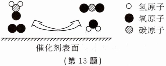 13. 装修中可能有甲醛${(CH_{2}O)}$释放,利用催化剂可消除装修材料释放的甲醛。反应的微观结构示意图如图所示,写出该反应的化学方程式:${CH2O + O2\xlongequal{催化剂}CO2 + H2O}$
