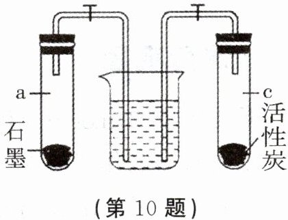 10. 如图所示,先在 a、c 两支相同的试管中充满红棕色的 NO₂气体,然后分别向 a、c 两支试管中加入质量相等的足量石墨和活性炭并塞紧胶塞。经过一段时间后,打开弹簧夹,所观察到的现象是(