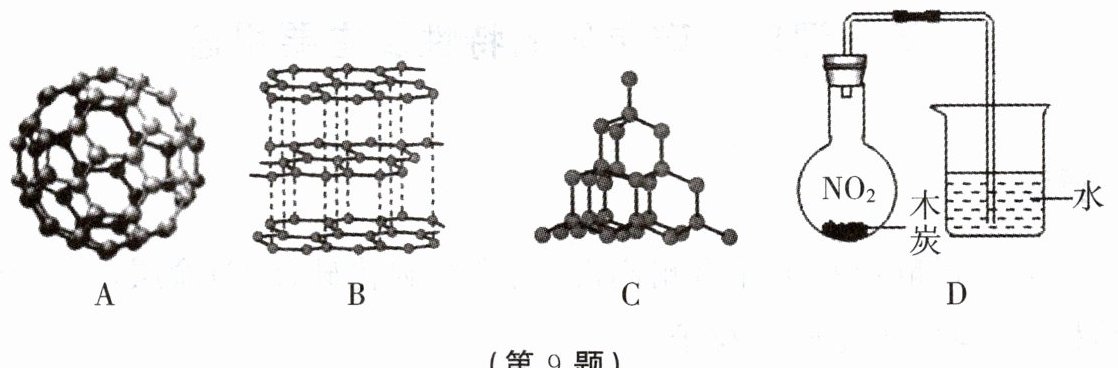 。(4) 图 D 中向盛有红棕色 NO₂气体的烧瓶中投入若干块木炭,连接好装置,稍待片刻,能看到红棕色变浅说明木炭具有