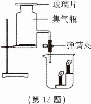 13. 如图,集气瓶中充满二氧化碳气体,大烧杯中燃着 2 支高低不等的蜡烛,实验时打开弹簧夹,移开玻璃片。下列说法正确的是(