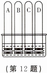 12. 如图所示的装置中,有四支充满不同气体的试管,倒立在水槽中,当拔开塞子时,试管中水位上升最高的是(