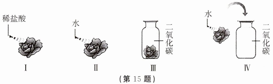 15. 取四朵用石蕊溶液染成紫色的干燥纸花,分别按下图进行实验。请回答下列问题。