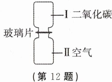 12. 如图所示,集气瓶Ⅰ、Ⅱ中分别装有二氧化碳和空气,把中间的玻璃片抽出,一分钟后,取下集气瓶Ⅰ,将燃着的木条伸入集气瓶Ⅱ中,木条熄灭,用微观粒子的观点解释现象。