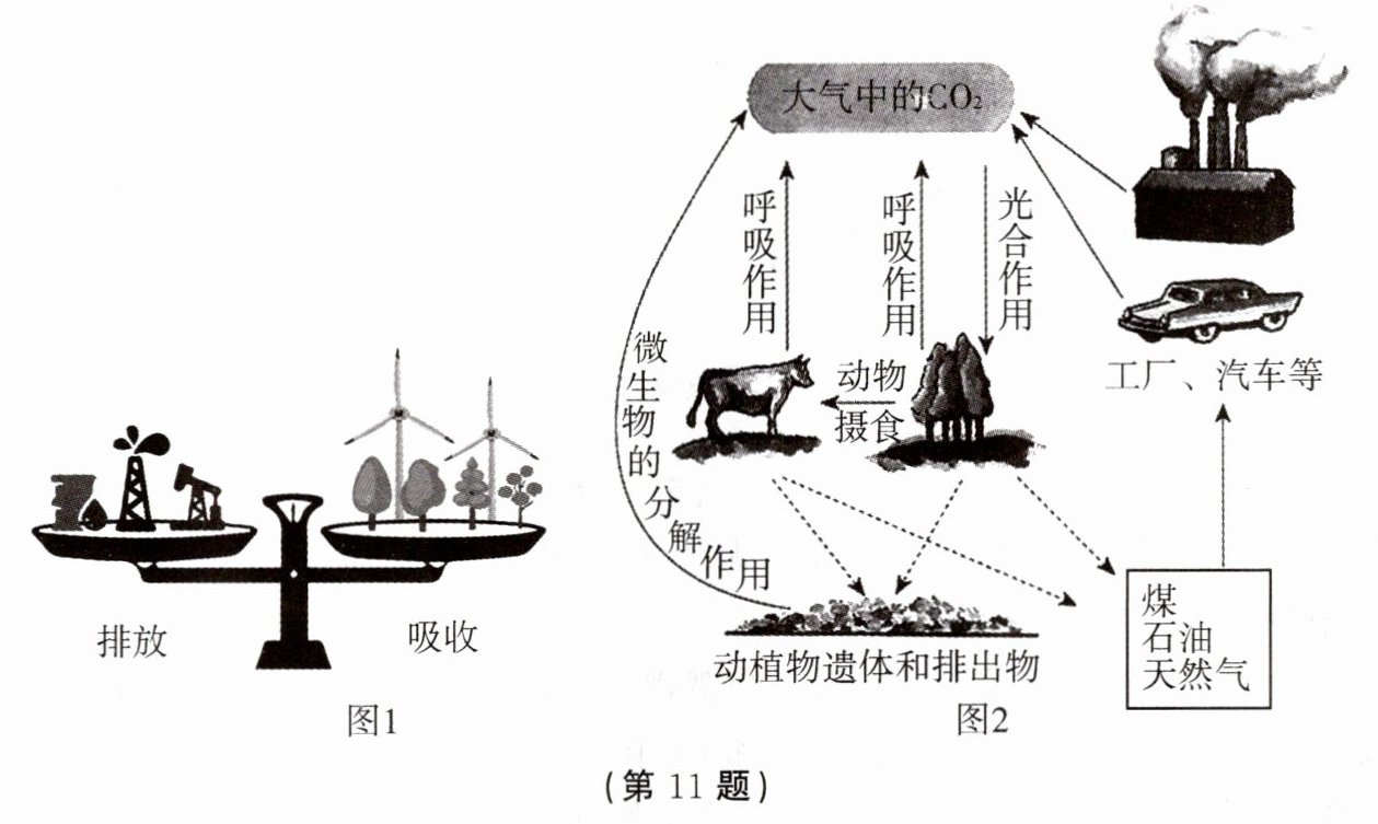 $11. $我国提出力争在$ 2030 $年前实现碳达峰,在$ 2060 $年前实现碳中和。$“$圆梦$”$小组同学确立了以$“$碳中和$”$为主题的学习内容,力求构建碳中和理念,努力践行低碳行动。请你参与完成以下任务。