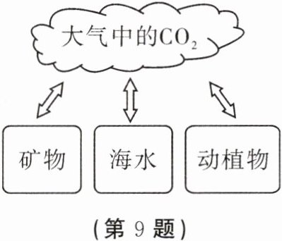 、岩石吸收和水体吸收等。岩石$($主要成分为碳酸钙$)$可以吸收二氧化碳生成碳酸氢钙$[Ca(HCO_3)_2],$请你写出这一过程发生反应的化学方程式: $CaCO₃ + CO₂ + H₂O\xlongequal{}Ca(HCO₃)₂$