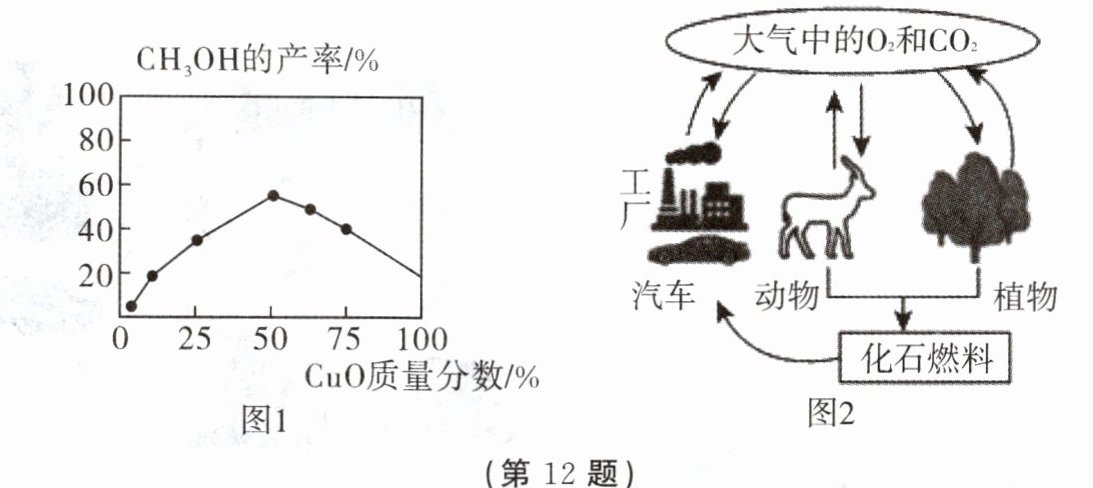 碳在自然界中的循环变化,对于生态环境有极为重要的意义。随着工业生产的高速发展和人们生活水平的提高,排入大气中的$CO_2$越来越多,导致温室效应增强。减少$CO_2$排放,实现碳中和,已成为全球共识。碳替代、碳减排、碳封存、碳循环是实现碳中和的主要途径。研究机构发明了转化大气中二氧化碳的技术,该技术是在一定条件下,将二氧化碳和氢气转化为甲醇$(CH_3OH)$和水。甲醇的产率除受浓度、温度、压强等因素影响外,还受催化剂$CuO$的质量分数影响$($如图$ 1)。$碳循环$($如图$ 2)$是指碳元素在地球上的生物圈、岩石圈、水圈及大气圈中交换,并随地球的运动循环不止的现象。