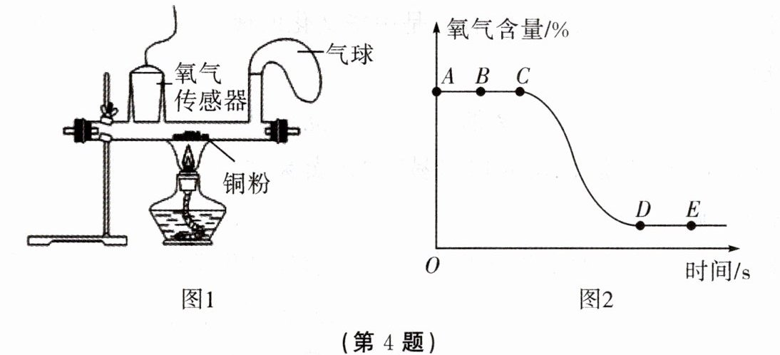 实验二:如图 1,将足量的铜粉置于硬质玻璃管中,利用氧气传感器测定加热过程中装置内氧气含量的变化情况,采集到的数据如图 2 所示。