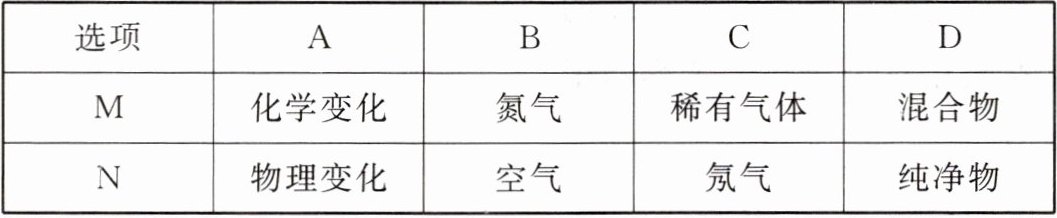 10. 化学概念之间具有并列、包含、交叉等关系,如图所示概念为 M 和 N 之间的包含关系。下表选项中所列概念之间的关系符合图中所示包含关系的是(