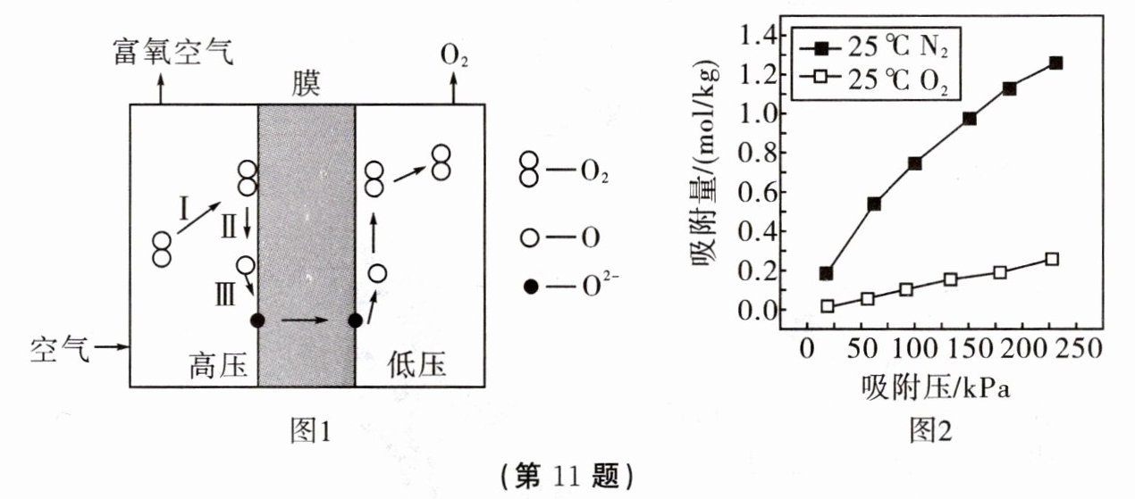 氧气瓶和氧气袋中的 O₂一般用深冷法制得,该方法利用物质沸点差异,从空气中分离出 O₂。制氧机有膜分离、变压吸附等制氧方式。膜分离制氧用到的膜材料有陶瓷、聚苯胺等,其中混合导电陶瓷分离膜的工作原理示意图如图 1。变压吸附制氧常用的吸附剂是沸石分子筛。科研人员在一定条件下分别将 N₂、O₂通过某种沸石分子筛,测定其对 N₂、O₂的吸附情况,结果如图 2(纵坐标数值越大,代表吸附量越大)。吸氧对于缺氧人群有一定作用,但健康人短期内高流量吸氧会对机体造成不良影响,因此不能盲目吸氧。