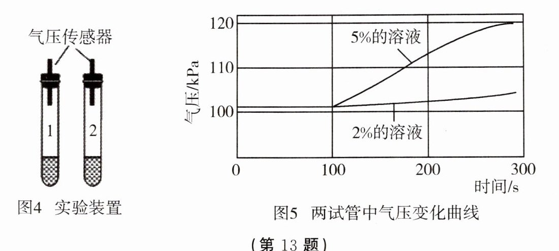 (8)如图 4,向两支试管分别加入等质量不同浓度的过氧化氢溶液,再加入等质量、等浓度的 FeCl₃溶液,分别用压强传感器测定两试管中气体压强的变化,得到曲线如图 5。