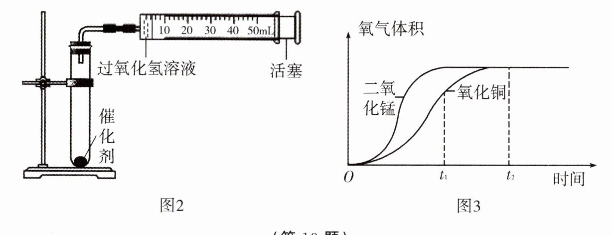 小组同学为了比较氧化铜和二氧化锰对过氧化氢分解的催化效果,用如图 2 所示的装置进行了两次实验。在试管中分别加入等质量的氧化铜和二氧化锰,分别将注射器内盛有的 5mL 5%的过氧化氢溶液注入试管中,利用注射器收集氧气,收集到氧气的体积和时间的关系如图 3 所示。