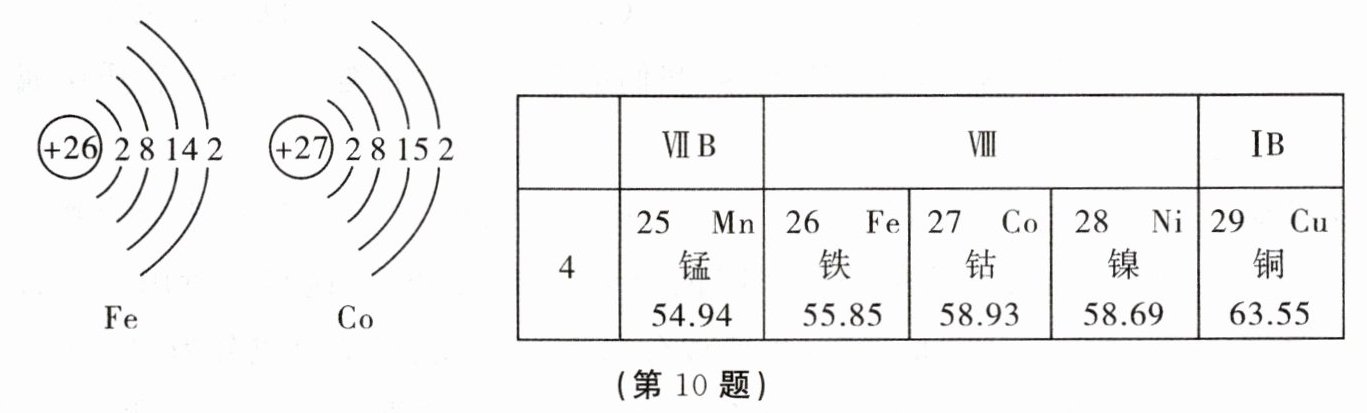 10. 青花瓷是中国极具代表性的一种瓷器。绘制青花瓷纹饰的原料中主要含有氧化钴(CoO)。在元素周期表中,钴的元素符号为Co,钴元素与铁元素同位于第四周期、第Ⅷ族。Fe、Co的原子结构示意图及在元素周期表中的信息如图。