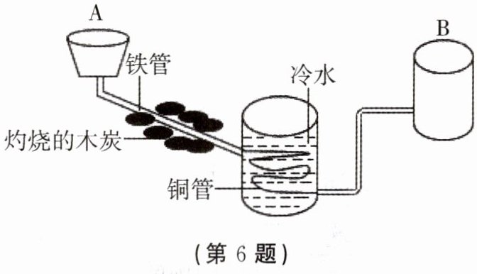 6. 1783 年,拉瓦锡利用如图装置探究水的组成:往 A 杯中加入水,水通过小孔进入灼热的铁管时发生汽化,水蒸气与灼热的铁反应,生成了一种黑色固体($Fe_3O_4$)和“可燃空气”,将气体通过放在冷水中的铜管,在 B 装置中收集到纯净的“可燃空气”。