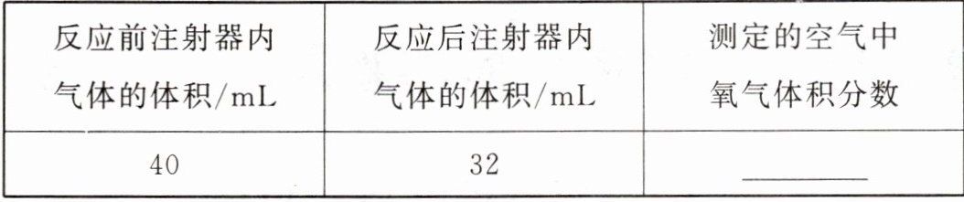 由两个注射器组成的密闭系统中留有 40 mL 空气,给装有细铜丝的玻璃管加热,同时缓慢推动两个注射器活塞,至玻璃管内的铜丝在较长时间内无进一步变化时停止加热,待冷却至室温,将气体全部推至一个注射器内,观察密闭系统内空气体积变化。