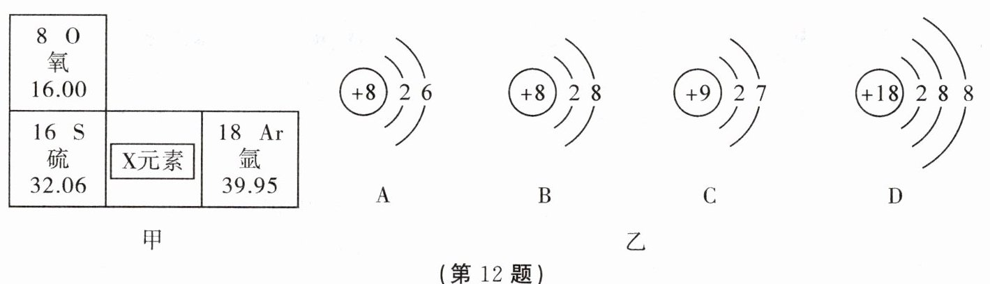 12. 元素周期表是学习和研究化学的重要工具。图甲是元素周期表的部分内容,图乙是四种粒子的结构示意图。据图回答下列问题: