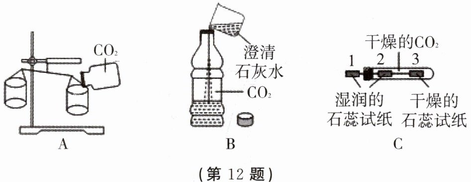。②B 实验,向充满 CO₂的软矿泉水瓶中倒入澄清石灰水,旋紧瓶塞后充分振荡,能观察到的现象是软矿泉水瓶收缩变瘪和