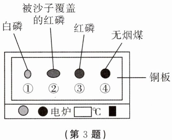 3. 用如图装置进行实验,升温至 $60^{\circ}C$ 的过程中,仅①燃烧;继续升温至 $260^{\circ}C$ 的过程中,仅③燃烧。下列分析不正确的是 (