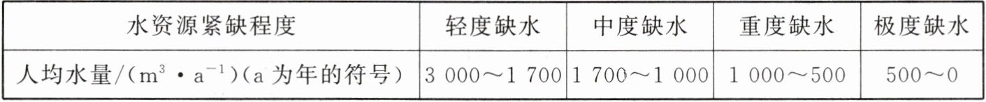 (1)我国也是缺水国家之一,人均水量约为 2 300 m³·a⁻¹,水资源紧缺情况为