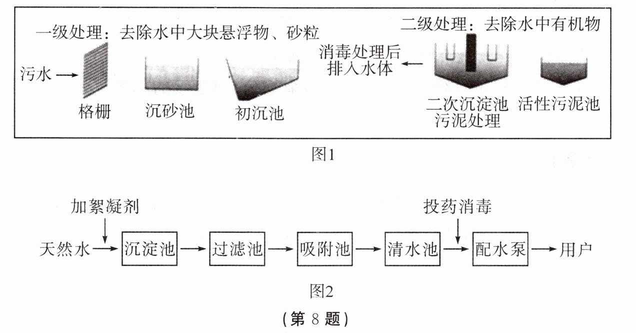 8. 水是一种宝贵的自然资源,污水处理厂的处理过程如图 1,自来水厂的净水流程如图 2。