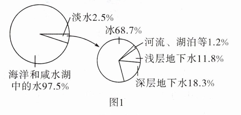 ① 由图 1 可知,可供人类直接利用的淡水资源占地球水量的 2.5%。