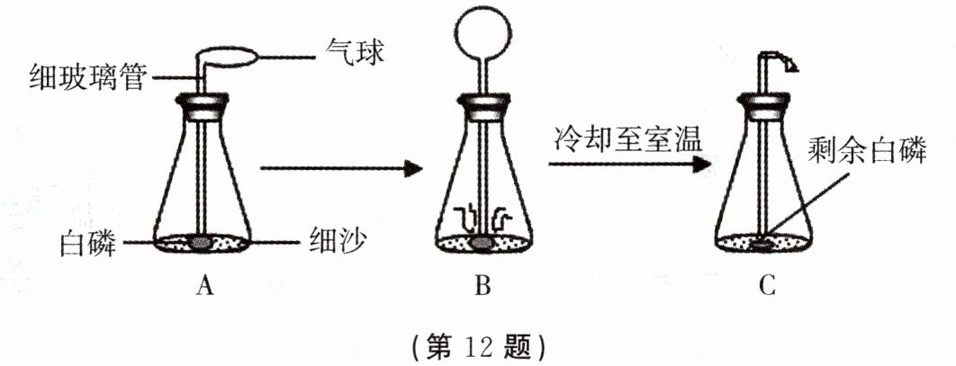 (2)白磷燃烧消耗氧气,生成固体五氧化二磷,使瓶中压强变小,小于外界大气压,在外界大气压的作用下,C中气球变小,A内压强等于外界大气压,所以A、C中气球大小不同。