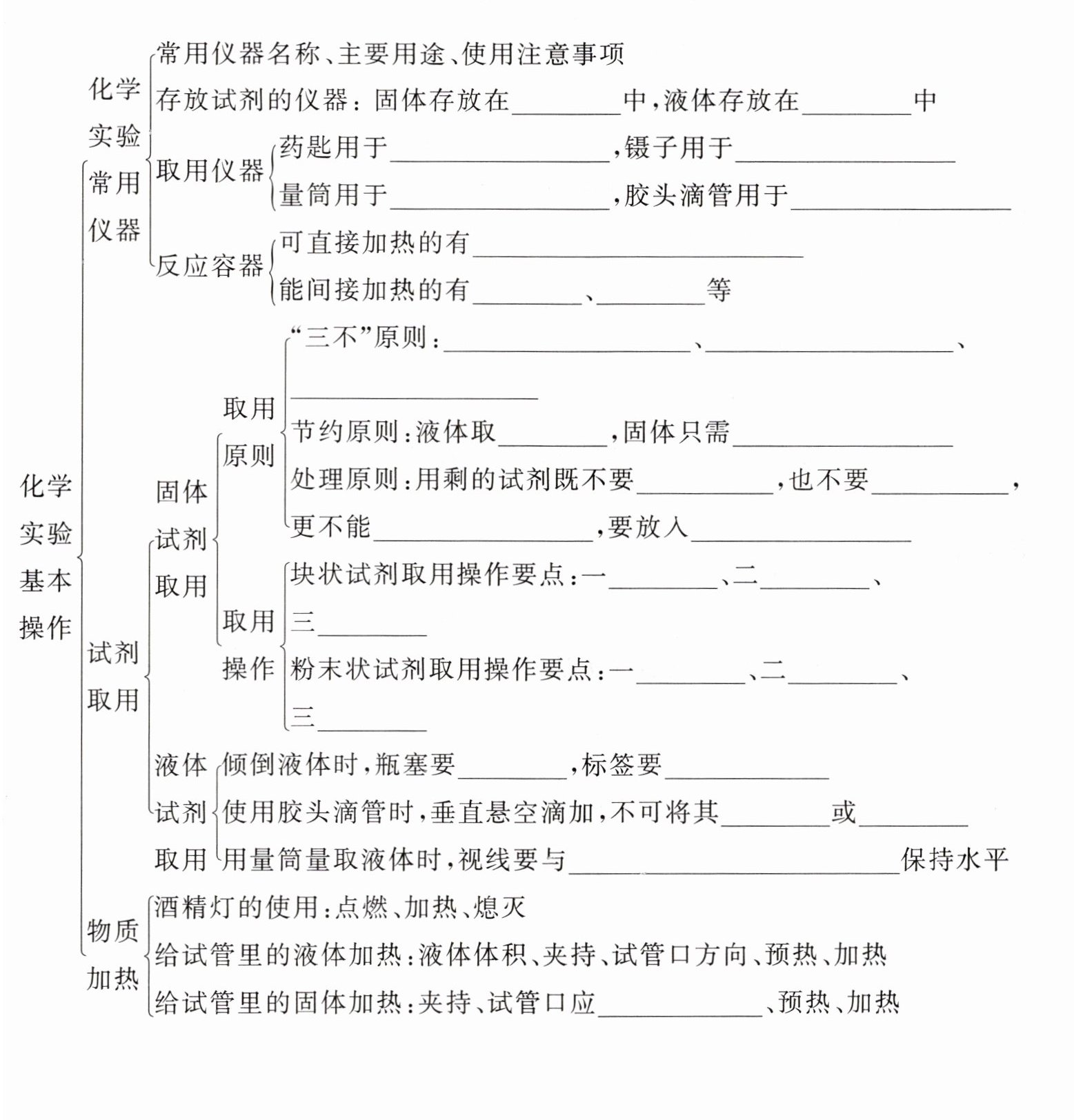 知识梳理 广口瓶 细口瓶 取固体试剂 取用块状固体 测量液体体积 吸取和滴加少量液体 试管、燃烧匙、蒸发皿 烧杯 锥形瓶 不能用手接触试剂 不要把鼻孔直接凑到容器口去闻试剂的气味 不得尝任何试剂的味道 1∼2mL 盖满试管底部 放回原瓶 随意丢弃 拿出实验室 指定的容器内 平 放 立 平 送 立 倒放 朝向手心 横放 倒持 量筒内液体凹液面的最低处 略向下倾斜 没有生成 生成 放热 产生气体 有无新物质生成 同时 化学 物理 化学变化 气味、熔点、沸点、硬度、密度 化学变化 可燃性 组成 结构 性质 转化及其应用 实验 化学知识 社会生活 化学实验