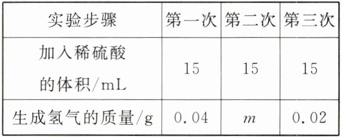 (1)根据题表可知,第一次加入$15mL$稀硫酸生成$0.04g$氢气,第三次加入$15mL$稀硫酸还能生成$0.02g$氢气,说明直到第三次添加稀硫酸后锌才完全反应,并且稀硫酸有剩余;同时说明第二次加入的$15mL$稀硫酸完全反应,生成氢气的质量与第一次相等,从而得出$m$数值为$0.04$。