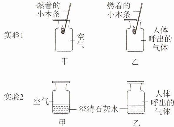 13. 小华同学做“人体吸入和呼出气体成分含量的差异探究”实验时,分别收集两瓶空气样品和两瓶人体呼出的气体进行探究。如图所示,关于这两个实验的说法正确的是(