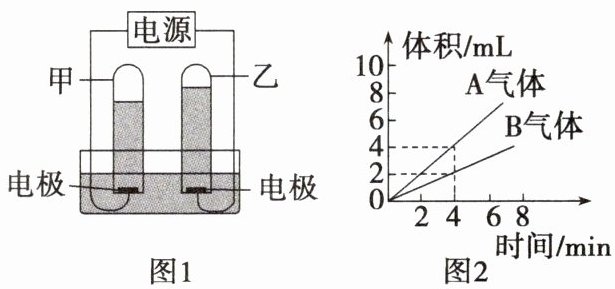(3)在电解水的实验中,将两极产生的气体的体积与时间的关系绘制成如图2所示的图像,由图2可以看出0~4 min及4~8 min内产生A、B气体的体积比都约为