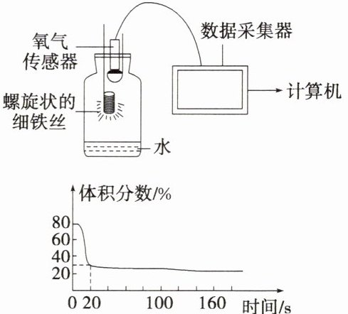 9. 某小组使用数据采集器探究“足量铁丝在O₂中燃烧”,集气瓶内O₂的体积分数随时间的变化关系如图所示。下列说法错误的是(