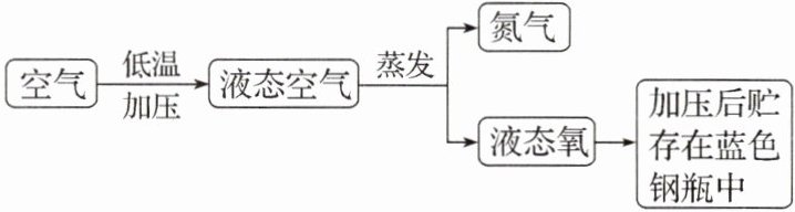 空气$\xrightarrow{低温加压}$液态空气$\xrightarrow{蒸发}$$\begin{cases} 氮气 \\ 液态氧\xrightarrow{加压后贮存在蓝色钢瓶中} \end{cases}$