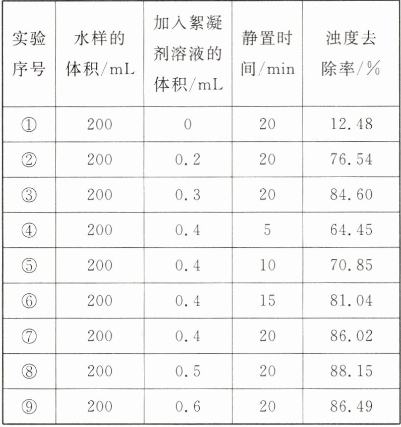 (4)由实验⑧⑨对比得出,两组实验中水样的体积与静置时间都相同,⑧中加入絮凝剂溶液的体积较少,浊度去除率较高
