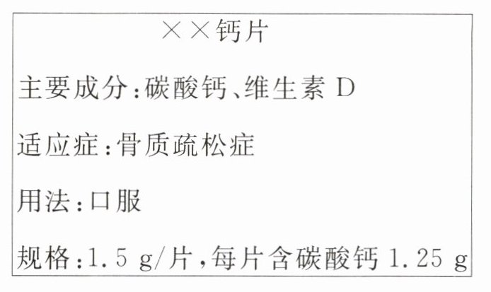 2. 下面是某补钙药品的部分说明。一个青少年在正常情况下每天需要摄入$0.8g$钙。若每天从食物中获取$0.4g$钙,其余吃钙片补充,则每天至少需服用该种钙片的数量是(